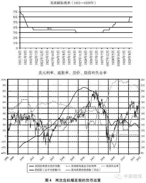 6.两次危机都与货币政策相关联。在两次危机之前,最方便的手段是采取更为宽松的货币信贷政策。大萧条前,泛滥的信贷政策引起了股市的泡沫和投机的狂热;在这次危机前,美联储极其宽松的货币政策、金融放松监管和次级贷款都达到前所未有的水平,使得经济泡沫恶性膨胀。在经济泡沫导致消费价格上涨的压力下,货币当局不得不采取紧缩货币政策,从而捅破了泡沫,改变了投机者的心理预期,使得迟早发生的事终于发生(见图4)。两者的主要区别在于,1929年大萧条还没有明确的宏观经济理论指导,而本次金融危机则是宏观经济政策长期服从于政治选举目标。两者的共同之处在于,货币当局对宏观经济形势都缺乏准确的理解,大萧条时期美联储的决策者基本没有总需求管理的意识,而这次美联储则对已经全球化的世界经济与美国作为储备货币国所应该执行的货币政策认识很不到位。
