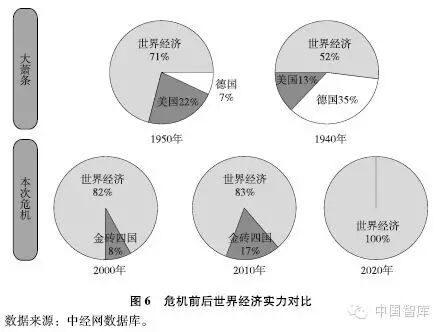 5.新兴国家崛起和全球经济格局不同。上次危机是资本主义世界的危机,欠发达国家受到严重的外部震荡,但只有消极接受的无奈,没有力量拉动全球经济回升。而本次危机截然不同,全球力量出现了结构性变化①,在发达国家内需下滑的时候,世界出现新的经济增长发动机,这些国家的巨大需求对经济下滑的拉升作用加大,全球经济危机可能从中心扩散到外围,但是从外围折射到中心的力量巨大。(①1929年美、欧、日以外的亚非拉国家GDP合计占世界GDP的23.3%,2010年则占到42.6%,危机期间的2009年金砖四国对全球经济增长的贡献达90% (数据来源:《世界经济千年史》, 人民网等)。)